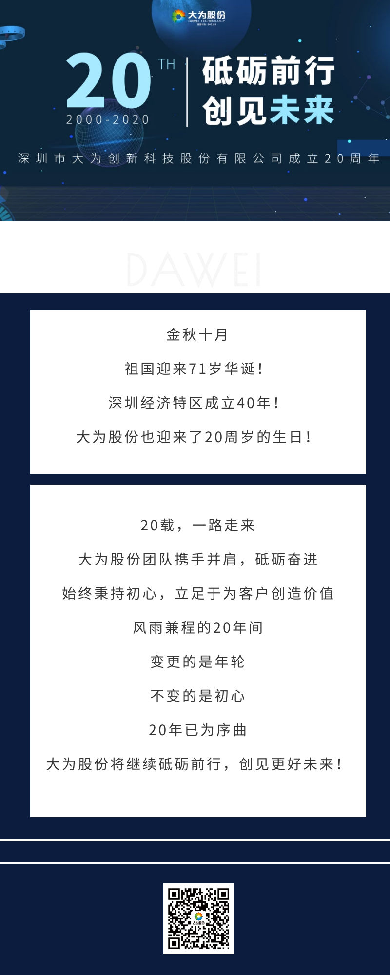 深圳市大為創(chuàng)新科技股份有限公司成立20周年!